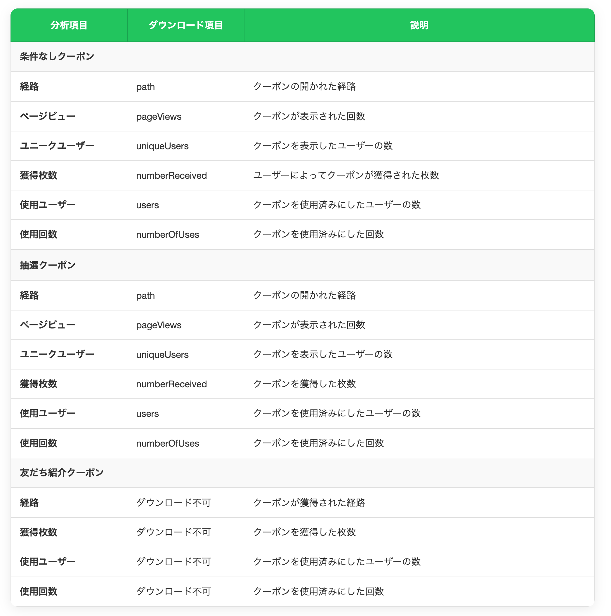 LINE公式の分析画面では、ツール欄の下にある「クーポン」から、クーポンの獲得経路・表示回数・使用状況などが確認できます。クーポン周りの分析結果のダウンロードもこちらから可能です。(詳細は下表参照)