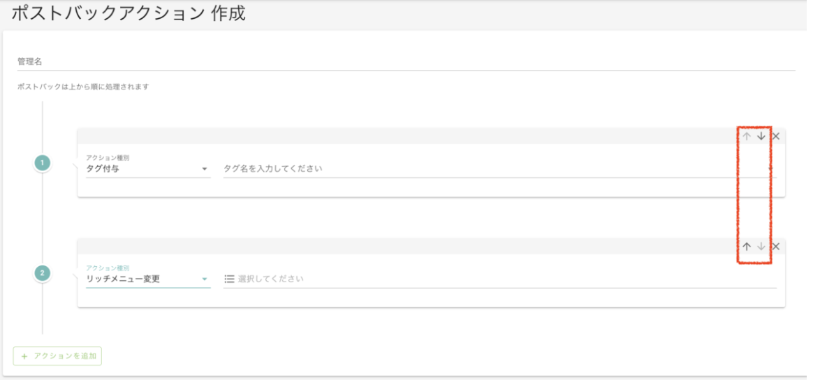 そこで、ポストバックアクションが上から処理されることを明示するとともに、矢印で順番を入れることが可能に!