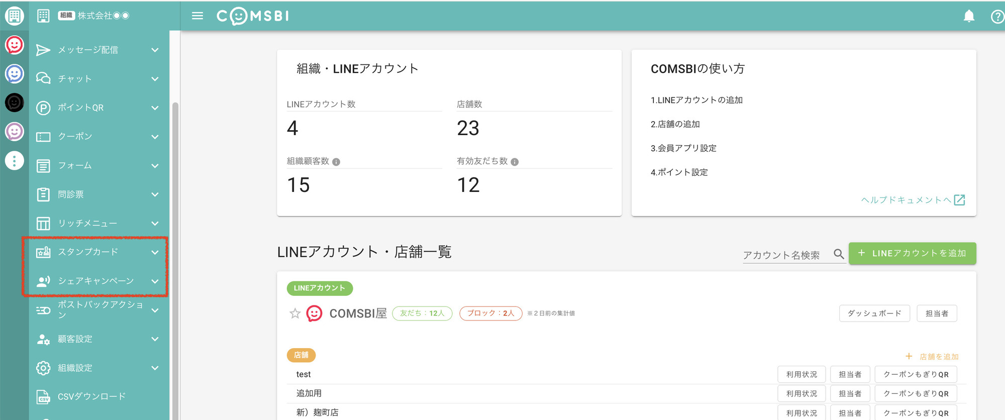 マルチアカウントでの一括管理はCOMSBIの特徴、そして最大の推しポイントです!各LINEアカウント単体での施策実施ではなく、組織内のアカウント間での買い周りのスタンプラリーなど、組織の全てのアカウントでスタンプラリーや友だち紹介ができるようになったため、複数アカウント運用中のお客様にぜひご活用いただきたい機能です。