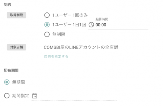 1月のリリース前までは配布用クーポンでは取得制限が【1ユーザー1回のみ】【1ユーザー1日1回】でしたが、【無制限】も選択できるようになりました。