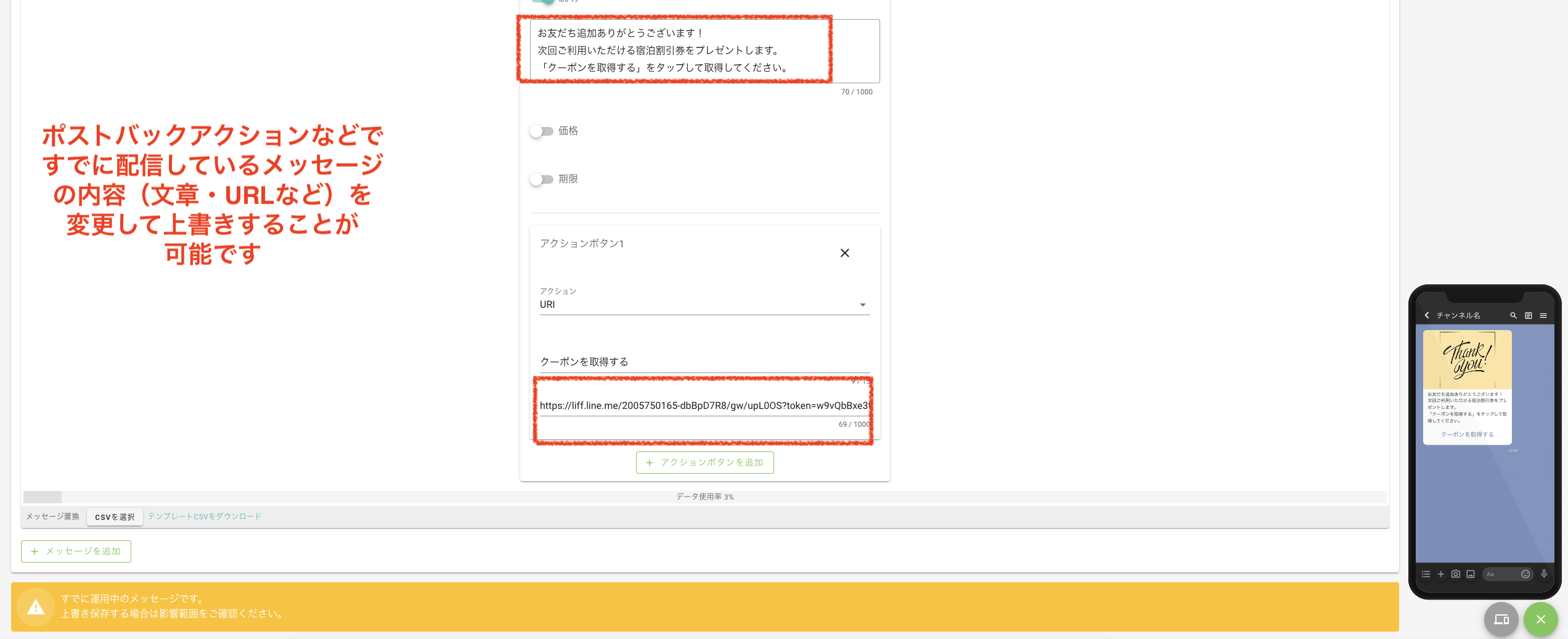 本機能リリース前は一度作成して保存したメッセージの内容やURL、画像などを変更する場合は、また一から作成し直し、ポストバックアクションなどに設定し直す……という作業が必要でしたが、リリース後は、作成し直さずとも、内容を変更・差し替えられるように!