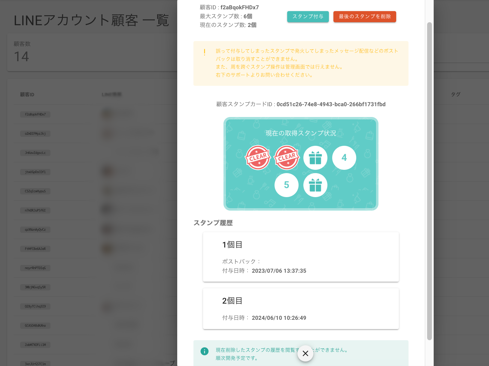 この機能がリリースされたことにより、顧客一覧よりスタンプカードの「スタンプ履歴」を確認でき、「スタンプ付与」、「最後に押されたスタンプの削除」ができるように。