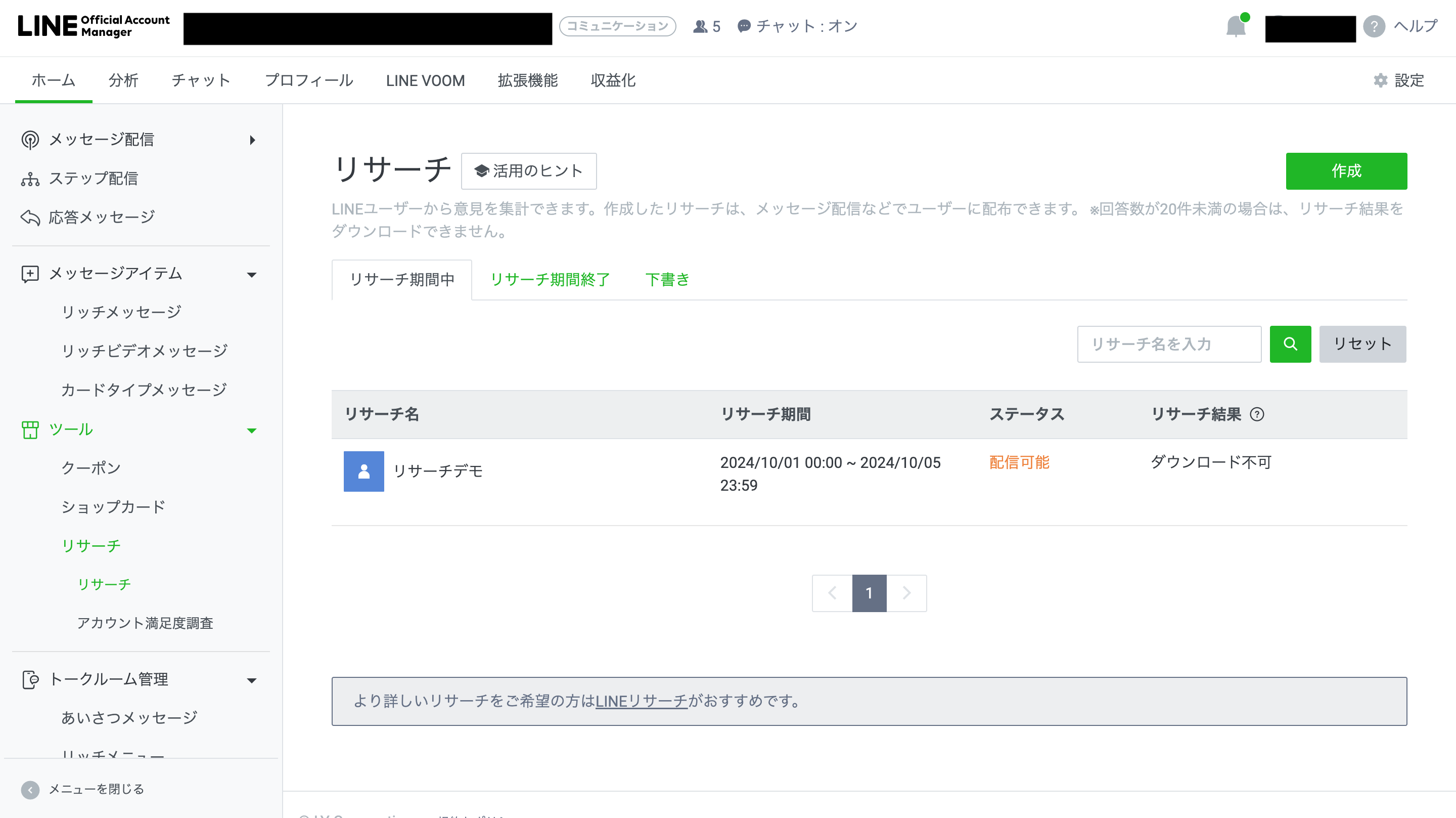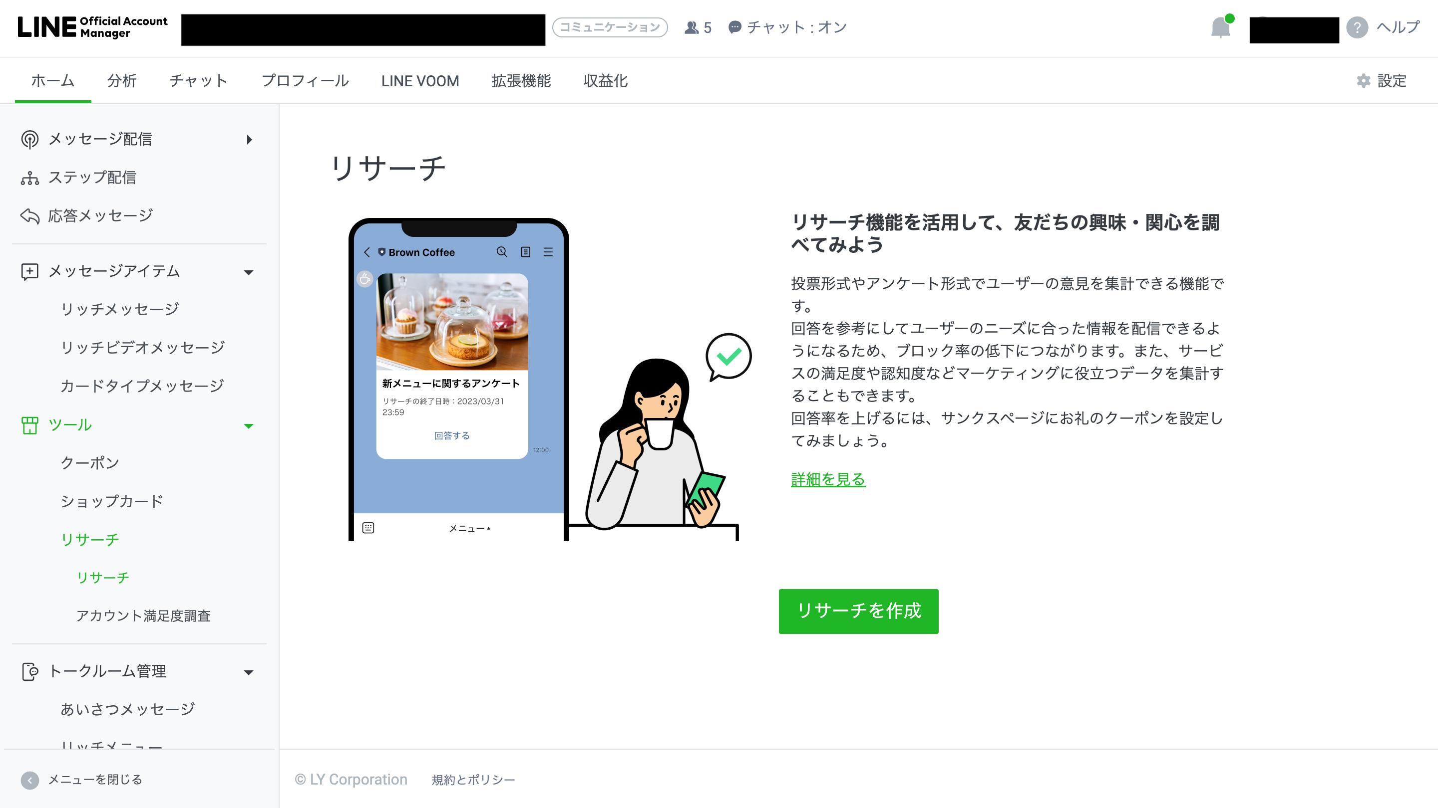 まずは、LINE公式アカウント(LINE公式)でアンケートが行える「リサーチ」機能について概要を紹介。似た名前の別サービス「LINEリサーチ」との違いも含めて以下、みていきましょう。