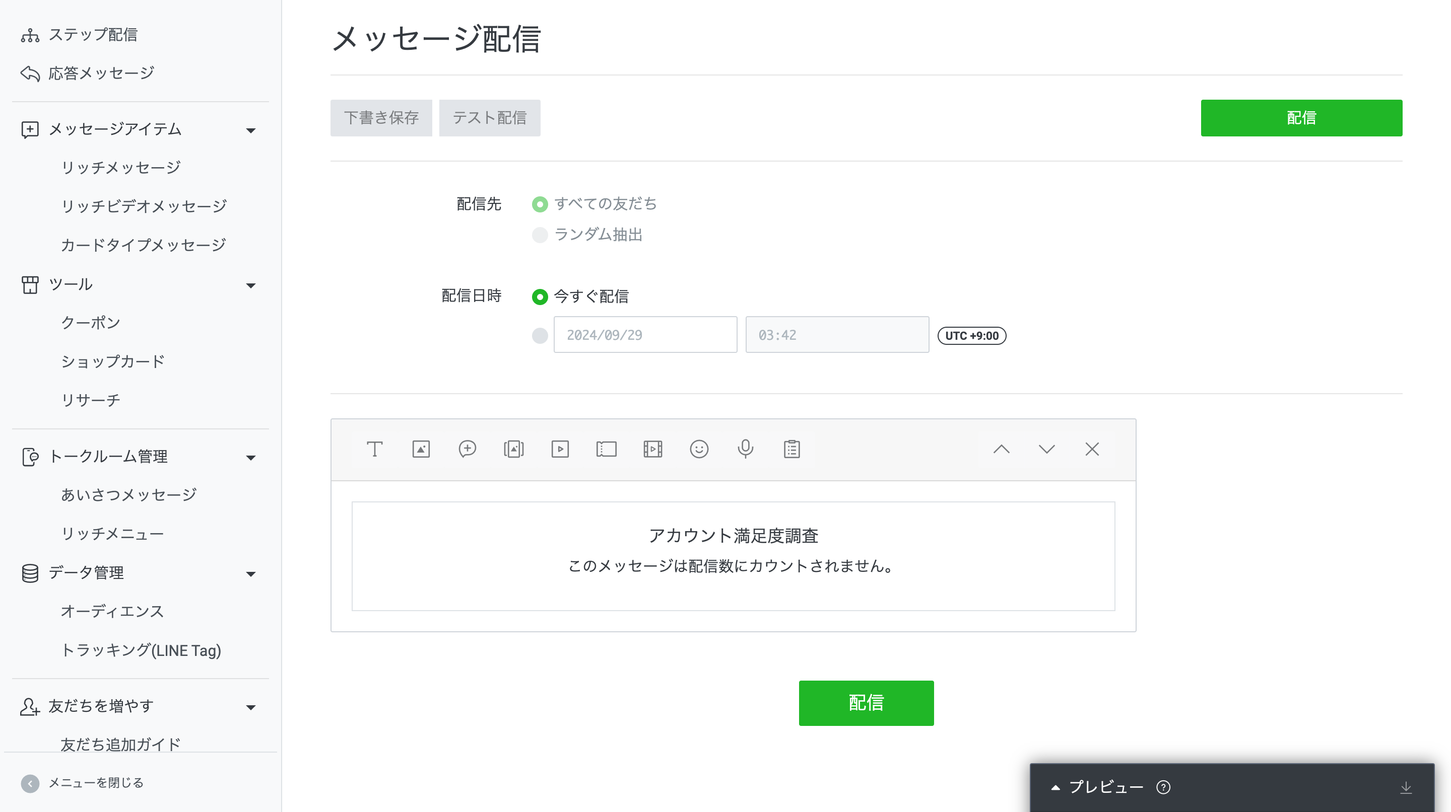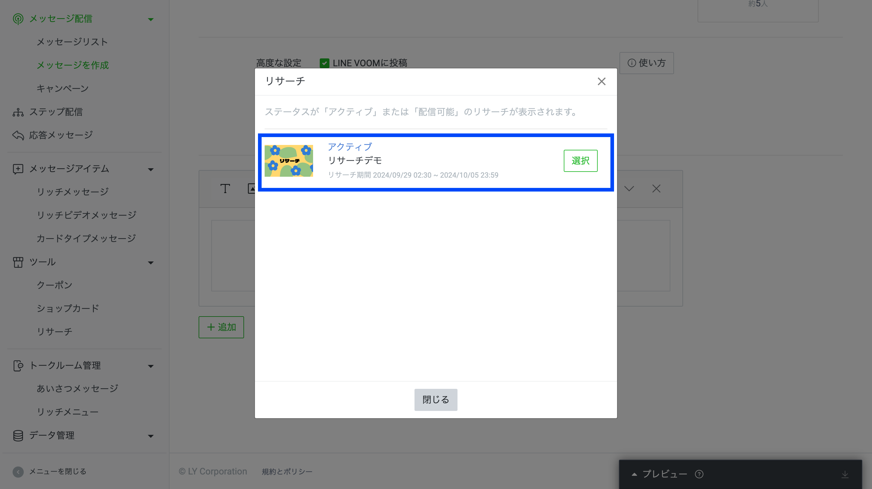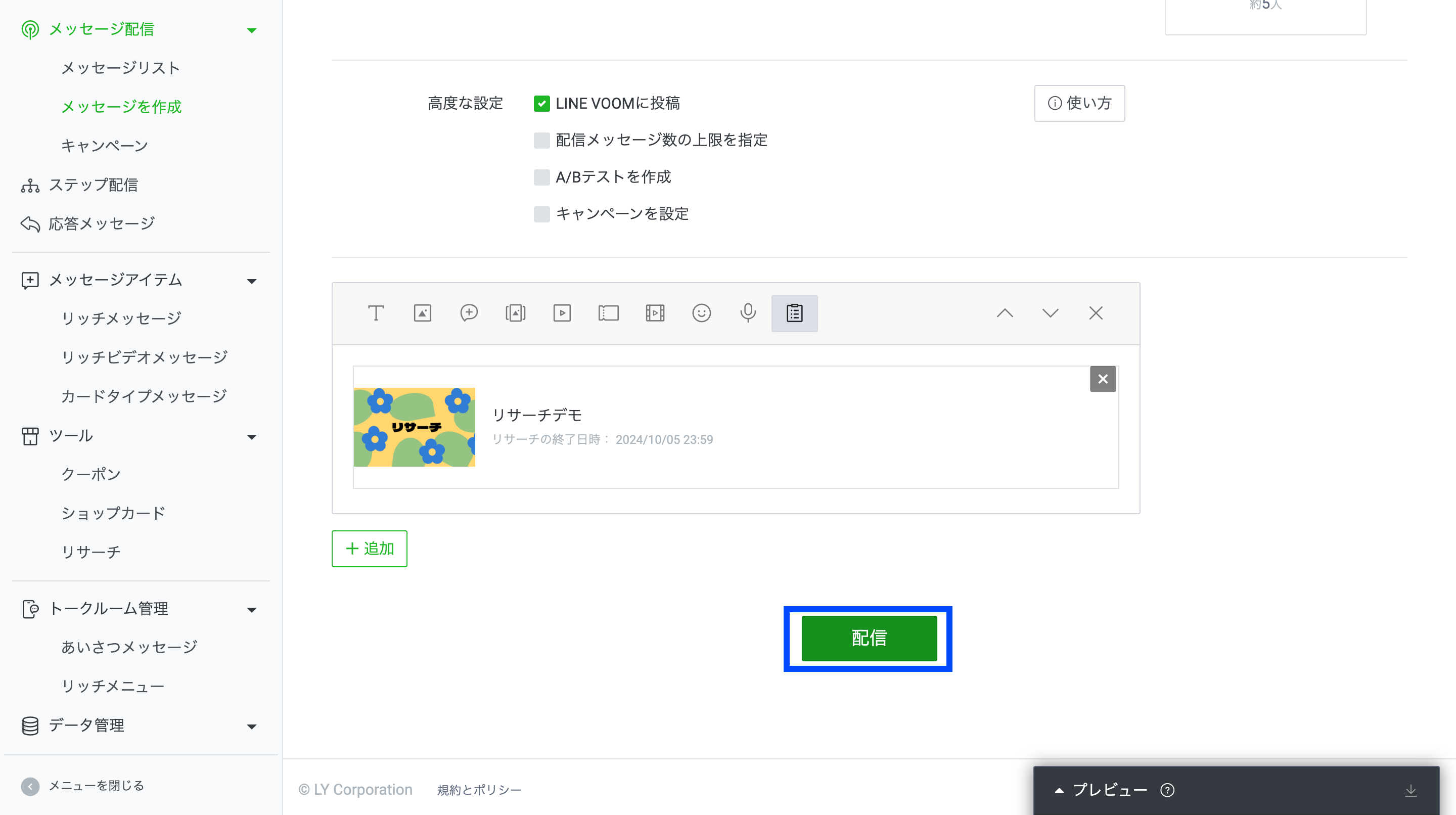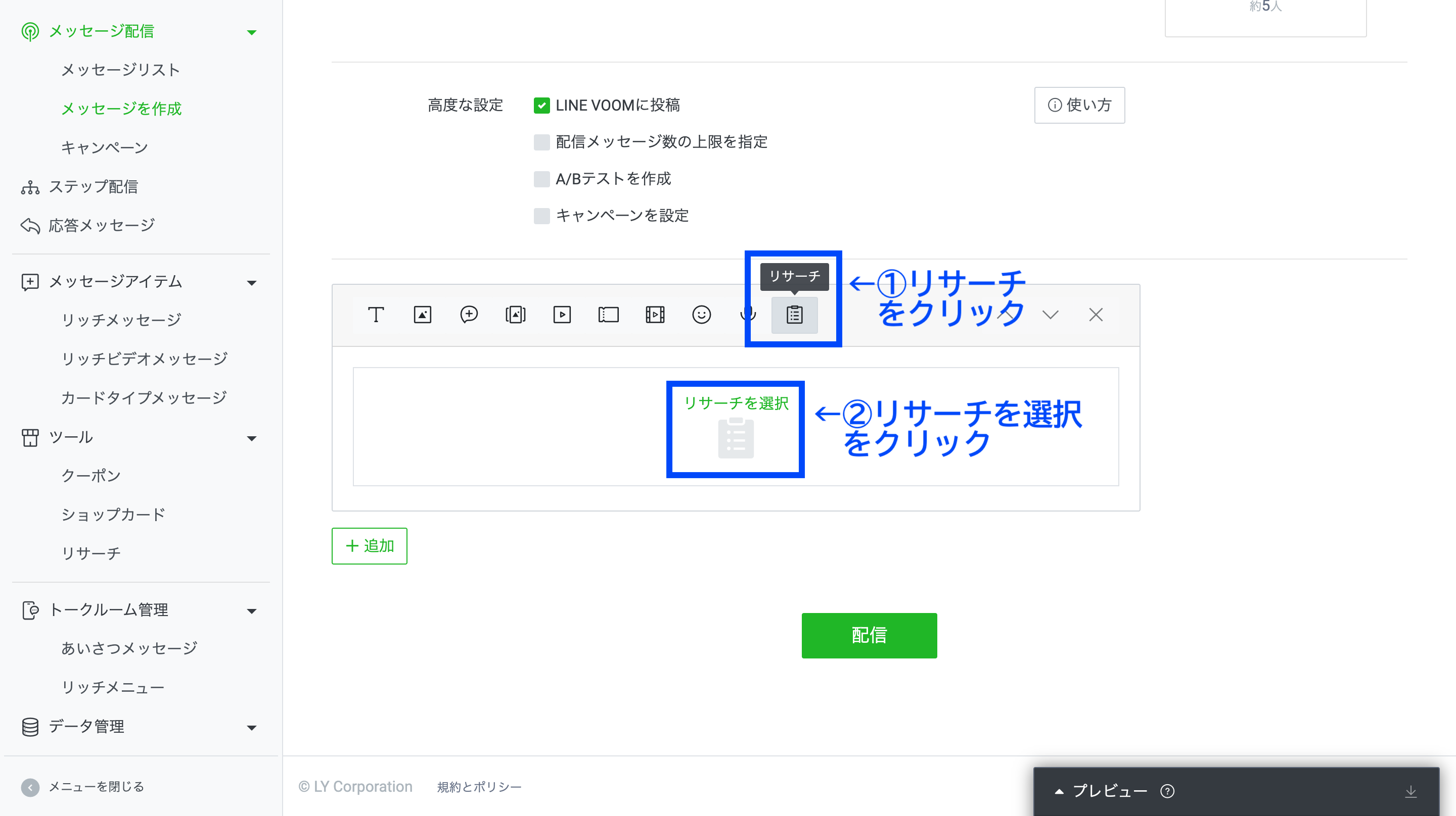 作ったリサーチは、各種メッセージ配信を通してユーザーに公開できます。今回は、リサーチをメッセージ配信の吹き出しに設定する方法だけみていきましょう。(メッセージ配信の詳しい方法は割愛します)