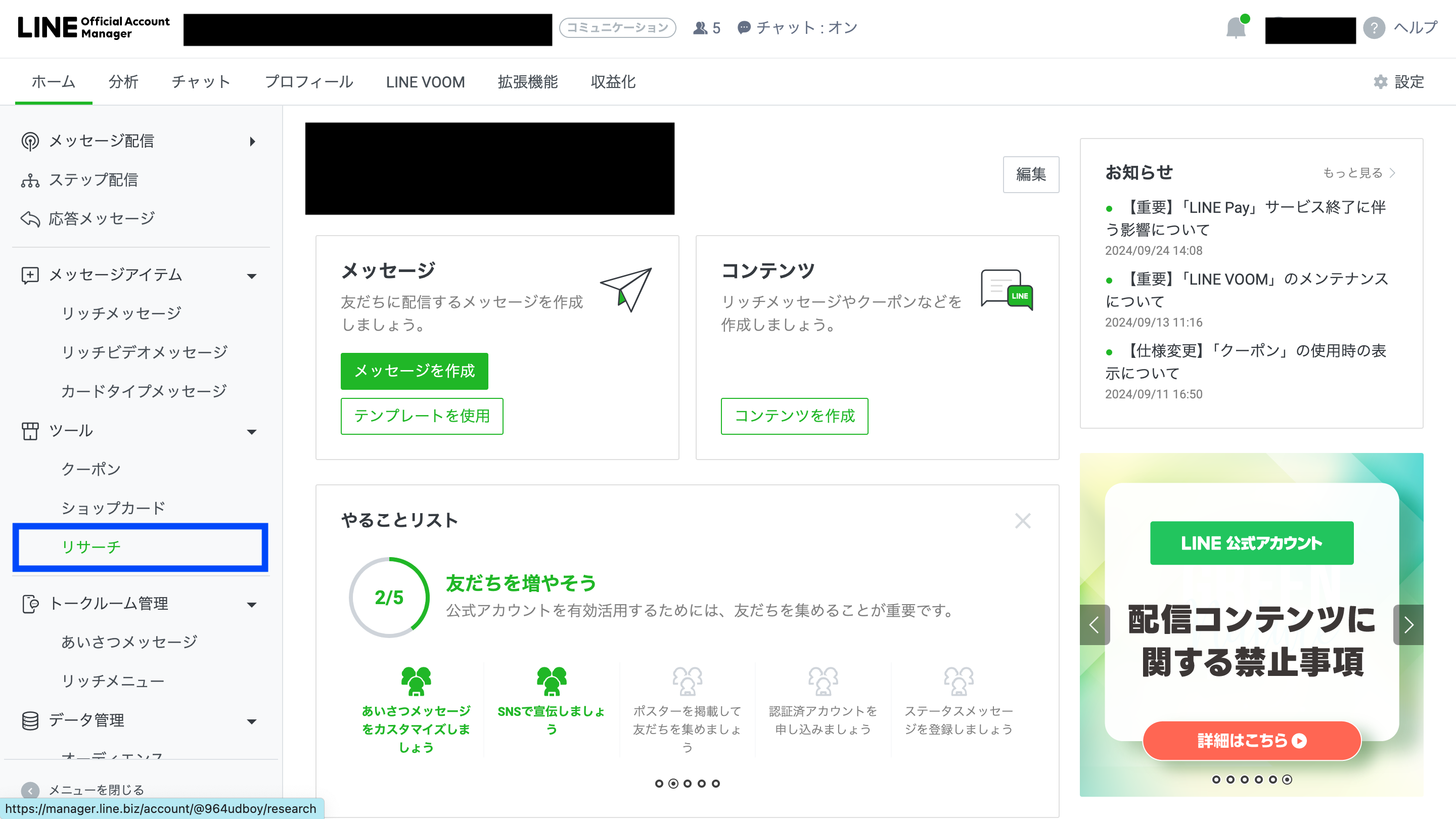 ここからは、LINE公式のリサーチ機能の使い方を徹底解説。実際の管理画面をお見せしながら、アンケート実施までの手順をお伝えしていきます。では早速、リサーチ機能の画面への移り方からみていきましょう。