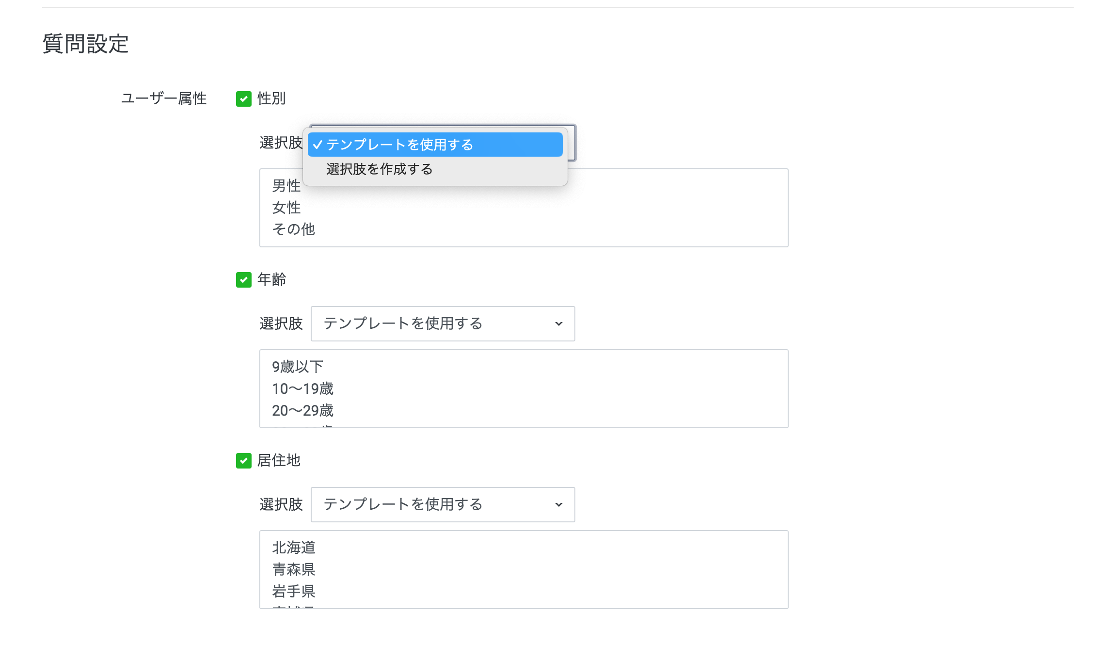リサーチ作成画面の2ページ目に移ると、最上部に「質問設定」の項目が出ています。こちらからは下記のとおり、基本の属性情報について、選択式の質問が設置できます。