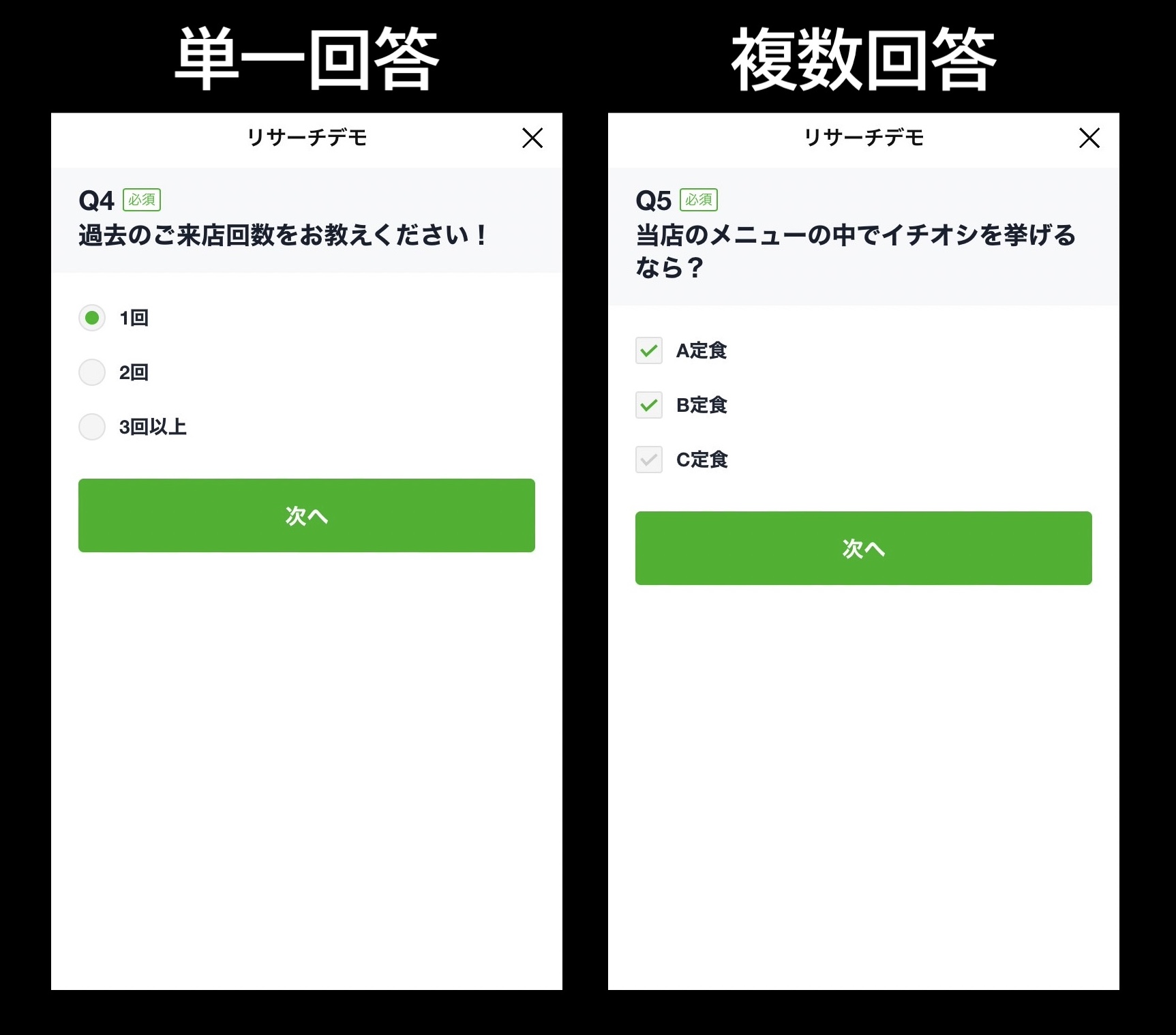 ちなみに、選択肢の単一回答と複数回答は下図のように表示されます。