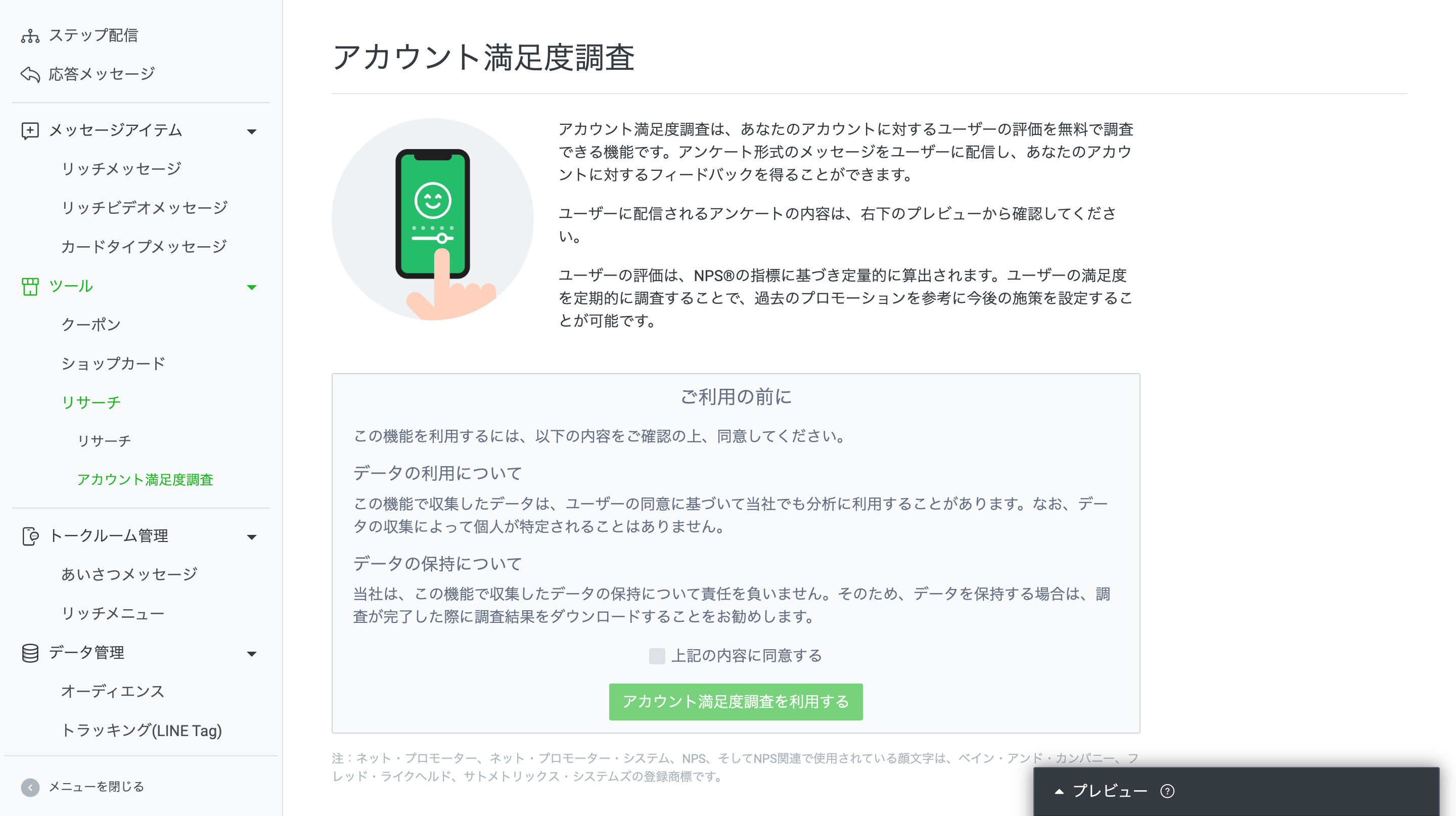 まずは、リサーチのトップ画面からサイドバー「アカウント満足度調査」をクリックしてみましょう。すると、初回限定で下図のような画面が表示されるはずです。