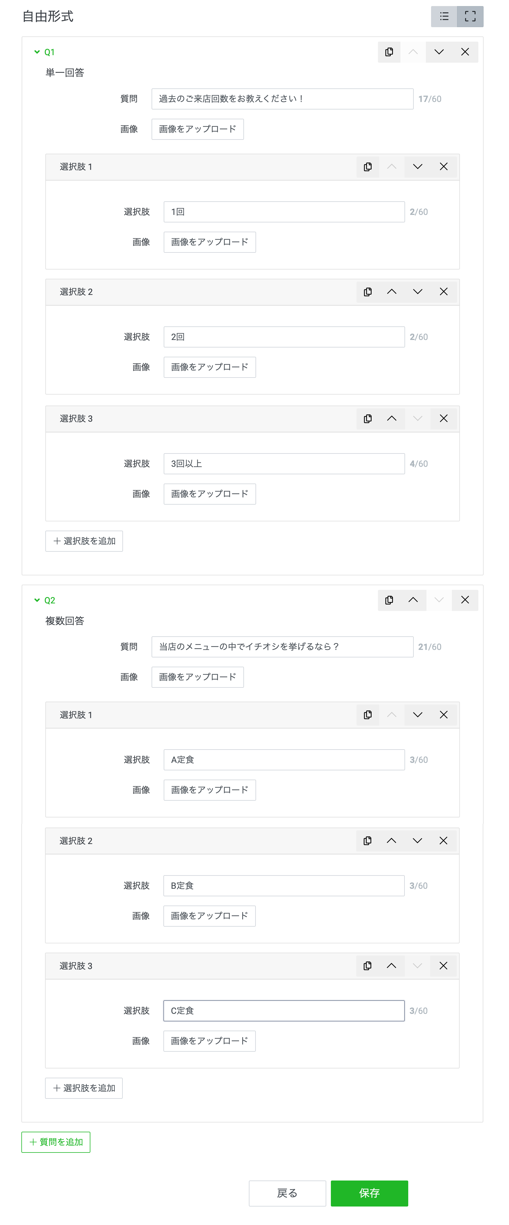 - +質問を追加:Q2以降の追加(Q7まで設置可)