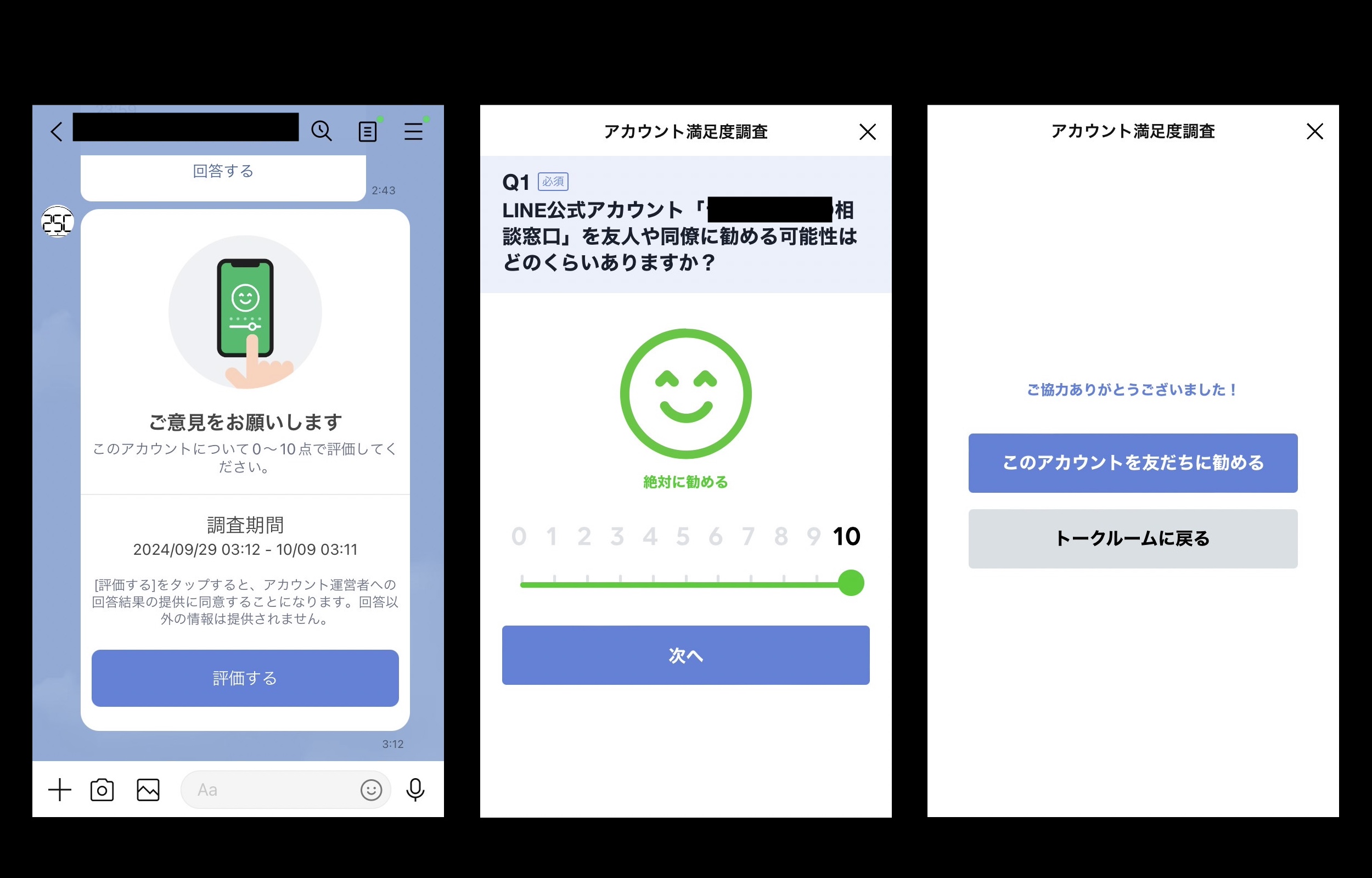 ちなみに配信後、トークルームでは下図のようにアカウント満足度調査が表示されます。