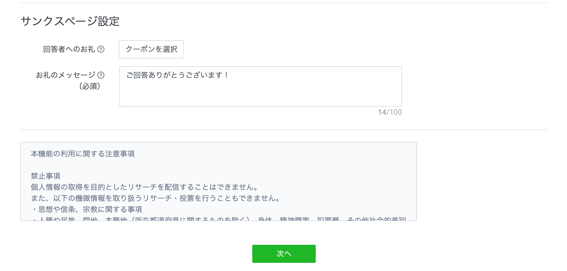 今度は、回答後のお礼の表示場所にあたる「サンクスページ設定」も、下記のとおり行います。